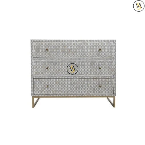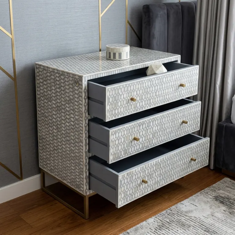 The art of bone inlay is specific to the udaipur region of India, where this meticulous skill is handed down from generation to generation. Three craftsmen are employed to make a piece of Bone Inlay furniture: the first hand-carves camel bone into delicate shapes; the second affixes the bone pieces onto a wooden frame in intricate patterns; while the third fills in around the bone with the coloured resin background. The entire process takes about 3 weeks.