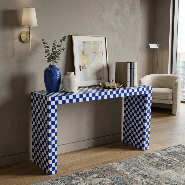 - Unique Chess Design: The console features a striking geometrical chessboard-inspired bone inlay pattern that adds a touch of visual intrigue to your decor. Each piece meticulously crafted, this console is a testament to artistic craftsmanship.