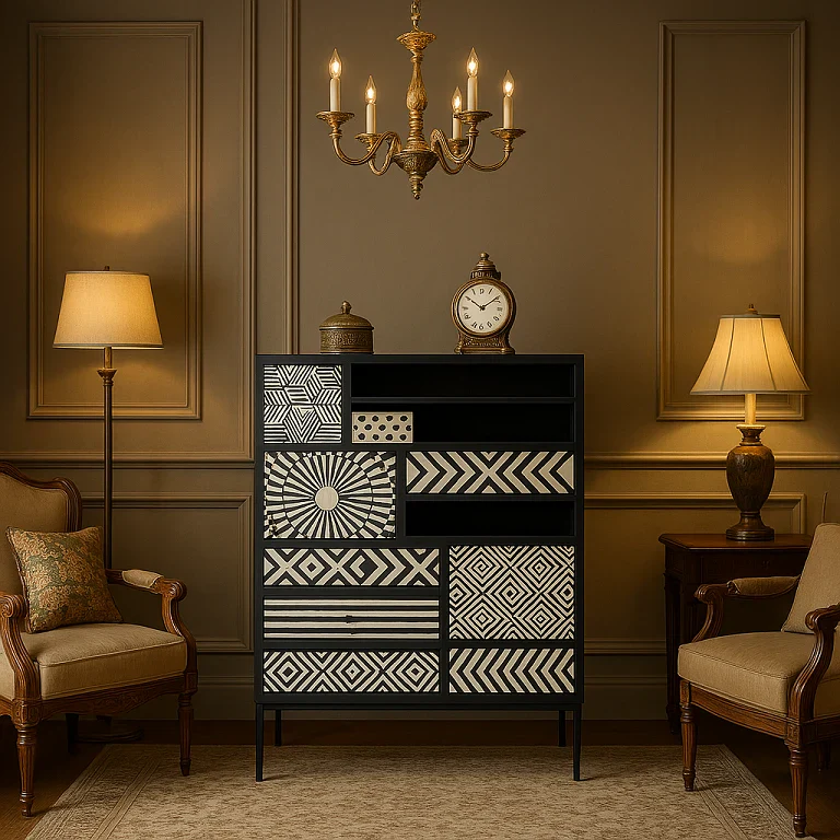 With a striking mix of geometric patterns and a bold black-and-white palette, the Ariel Bone Inlay Cabinet blends nine closed compartments – cupboards and drawers – with four schmuck shelves, letting you kill clutter and choose what you want to display and what you want to stash away. A fab feature piece in any fashion-forward space, Ariel is a favorite from our new season bone inlay collection which has been intricately hand-crafted by artisans in India using ethically-sourced camel bones.