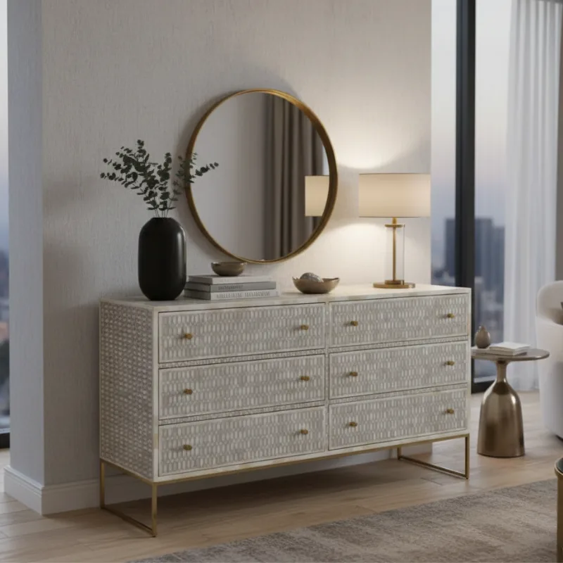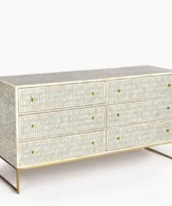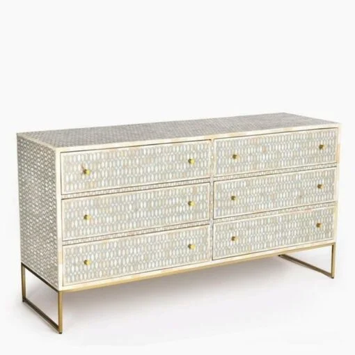 This Bone Inlay Chest of 6 Drawers Geometric Design in Grey Color made from small pieces of tiles those give here a wonderful addition to a hallway or living room, and can be used to accent home decorations and provide huge storage. The six drawers wooden bone inlay chest lovingly created with the use of camel bone and resin to cleverly piece together the exquisite pattern.