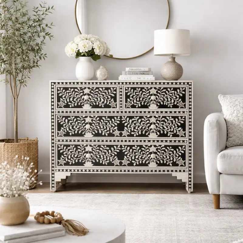 Black Floral Embossed Bone Chest Of 4 Drawers