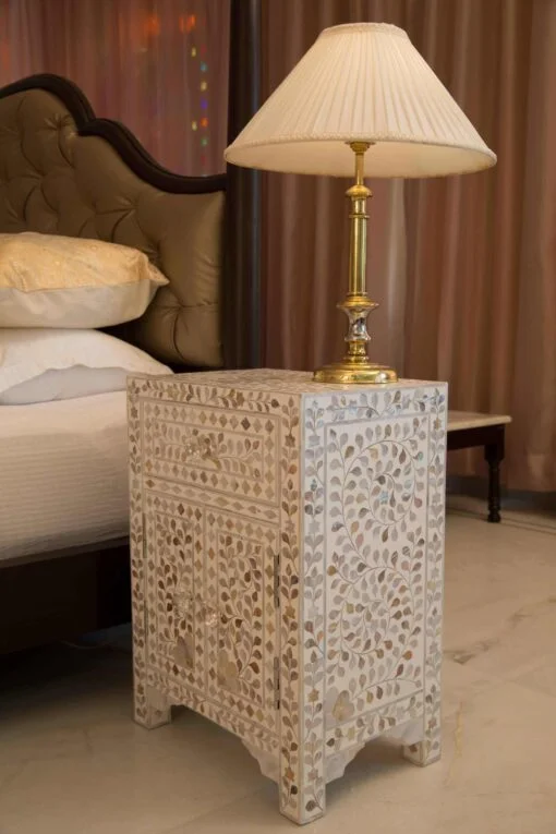 This Mother of Pearl Inlay 1 Drawer 2 Door Bedside White Color perfectly collides the best of traditional craftsmanship with the modern touch. Made by experts in the field, such as delicate hand-inlay work in this bedside table, which gives fine floral or geometric designs to it, will certainly dazzle any place. The sparkling pearly accents make a very lovely contrast with the clean, white background, providing a luxurious look to your place.