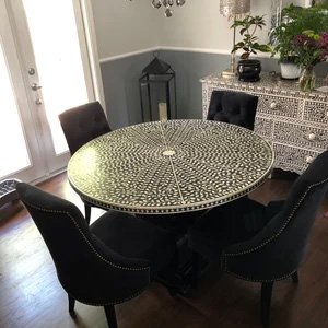 The Bone Inlay Round Coffee Table in Honeycomb Black is a masterpiece. Its intricate design adds a touch of elegance to any space. Craftsmanship is exceptional, and the quality is outstanding. It's both functional and stylish, a true statement piece.